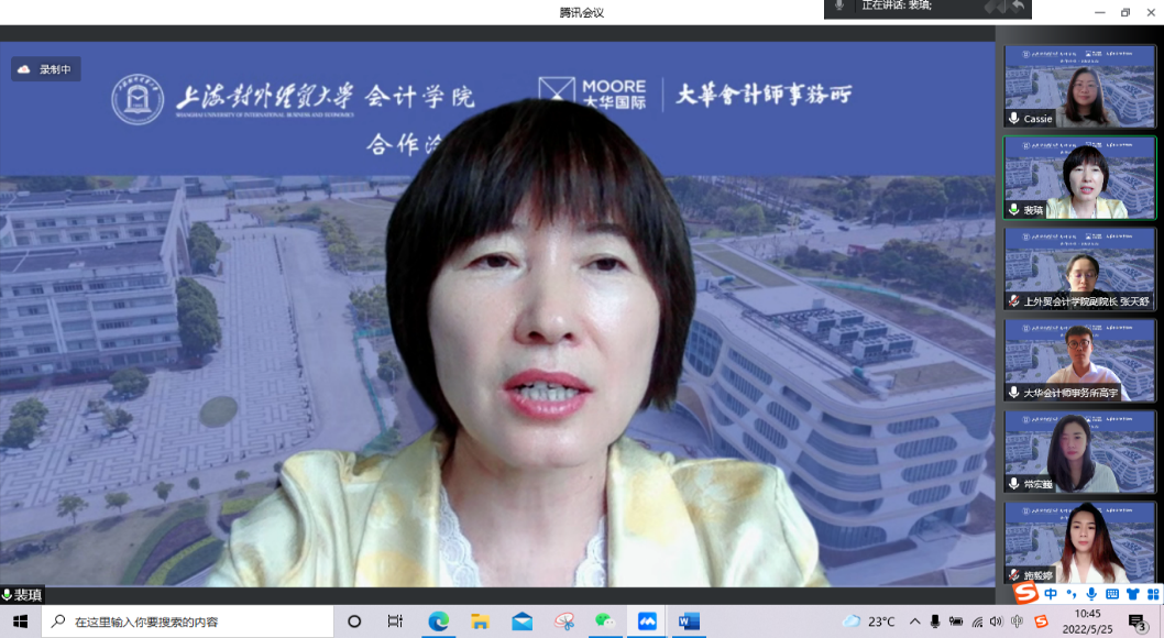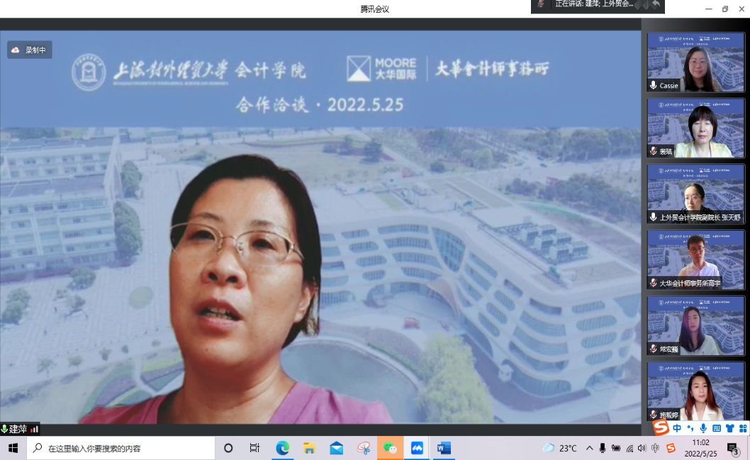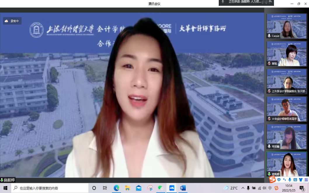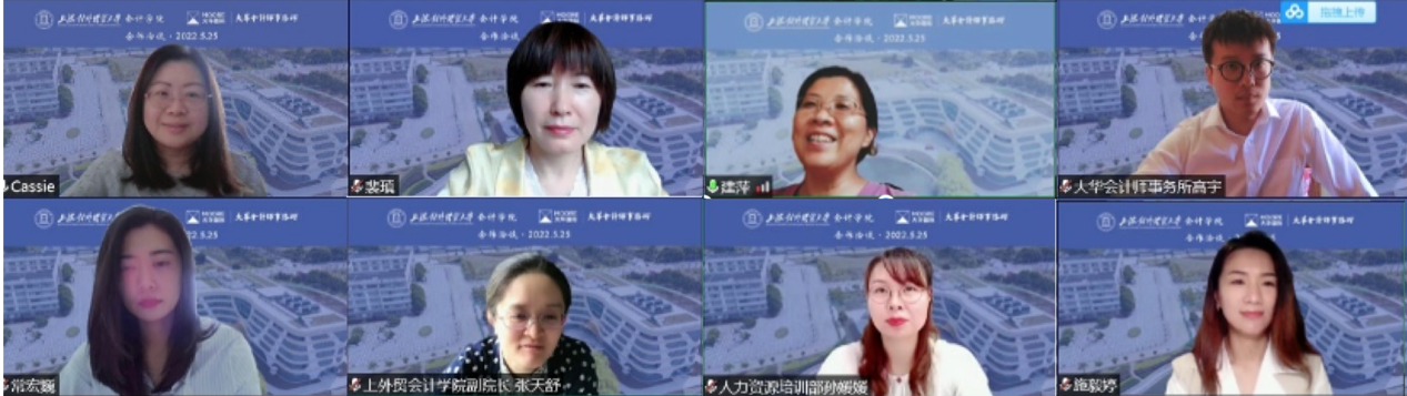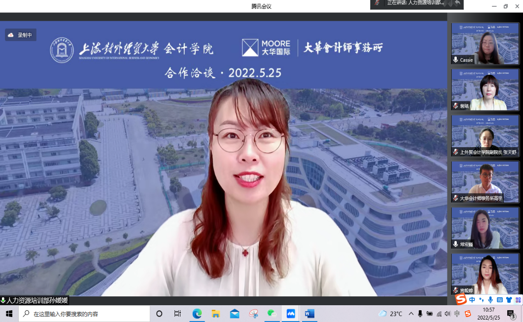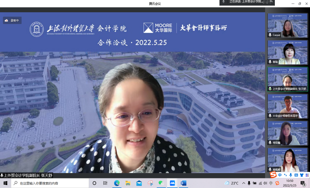 为贯彻落实党中央、国务院关于高校毕业生就业工作的决策部署,落实教育部关于全国高校书记、校长访企拓岗促就业专项行动,落实学校关于开展院长、书记访企拓岗促就业专项行动的通知,深入落实学院就业工作“一把手”工程,会计学院于5月25日,邀请大华会计师事务所进行了在线洽谈,双方就自身单位近况、产学研合作新方向、学生就业需求和用人趋势展开商讨。大华管理委员会委员/大华上海管理总部合伙人马建萍、大华总部人力资源总监孙媛媛及招聘团队、市场管理部高级经理邱雅丹,会计学院院长裴瑱教授、副院长张天舒教授、党委副书记施毅婷等出席了本次洽谈。