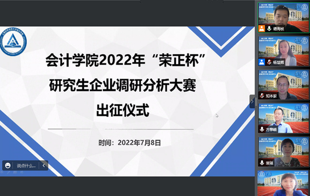 7月8日下午,会计学院2022年“荣正杯”研究生企业调研分析大赛出征仪式在云端成功举办。上海荣正投资咨询股份有限公司创始人、董事长兼首席合伙人郑培敏先生,荣正咨询资深合伙人、常务副总经理方攀峰先生,学校办公室主任、会计学院党委书记张嵘老师,会计学院院长裴瑱教授,副院长杨慧辉教授,党委副书记施毅婷以及各支参赛队伍的指导老师和队员共同出席了此次出征仪式。出征仪式由会计学院MPAcc教育中心副主任谭海桢主持。