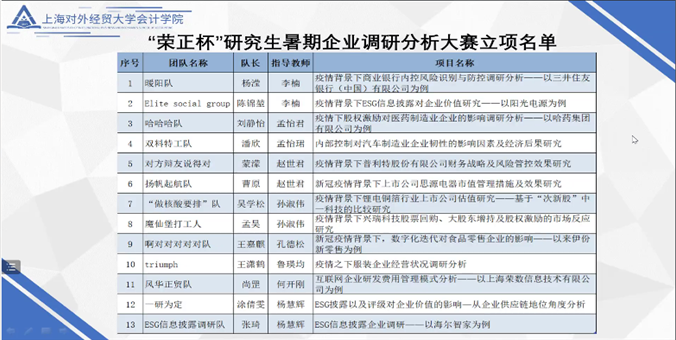 本次“荣正杯”研究生企业调研分析大赛的主题是:疫情背景下企业公司治理、财务战略、内部控制与风险管理、会计管理、ESG战略。13支参赛队伍在暑假将深入企业开展实地调查,研究分析疫情背景下企业公司治理环境和机制的变化,如何进行精细化的内部控制与风险管理、如何制定与实施积极的财务战略和会计管理等,并撰写调研案例分析报告,为企业提出可行的解决方案。期待同学们能在此次大赛中获得佳绩,预祝本次“荣正杯”研究生企业调研分析大赛取得圆满成功。