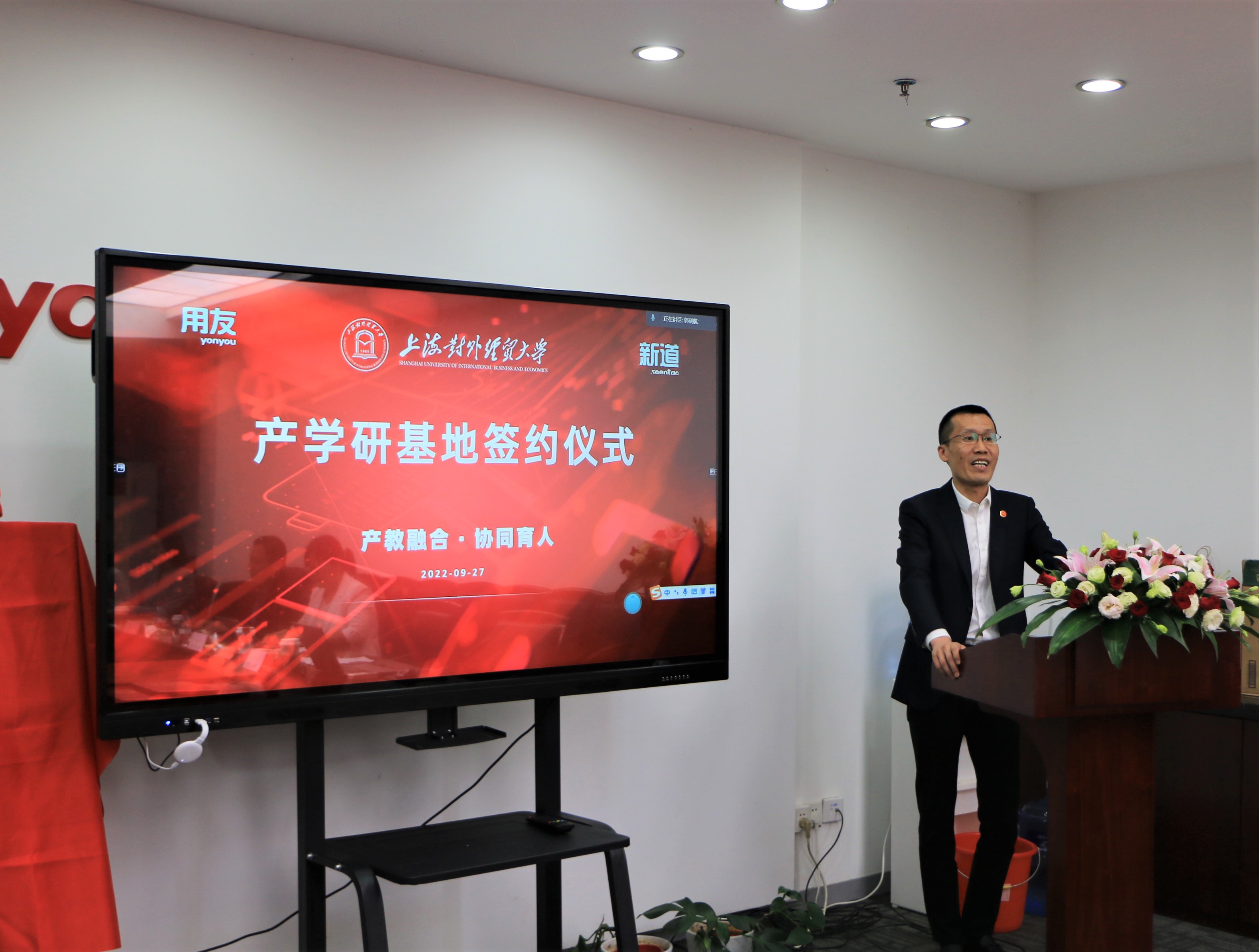 9月27日,会计学院与用友网络科技股份有限公司及新道科技股份有限公司举行产学研基地签约及授牌仪式隆重举行,副校长徐永林参加签约仪式并致辞。学校办公室主任、会计学院党委书记张嵘,会计学院院长裴瑱,副院长杨慧辉、孙淑伟,会计学院党委副书记施毅婷,会计系教工支部书记何开刚,辅导员李钦儒,用友网络科技股份有限公司上海分公司副总经理米亮,新道科技股份有限公司副总裁刘丽、上海区总经理林斌、江南区副总经理钱丽及相关部门负责人参与此次签约和授牌仪式。