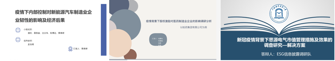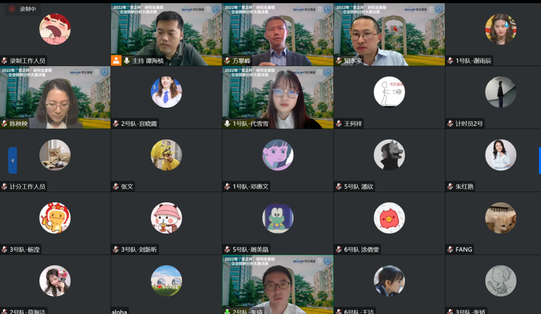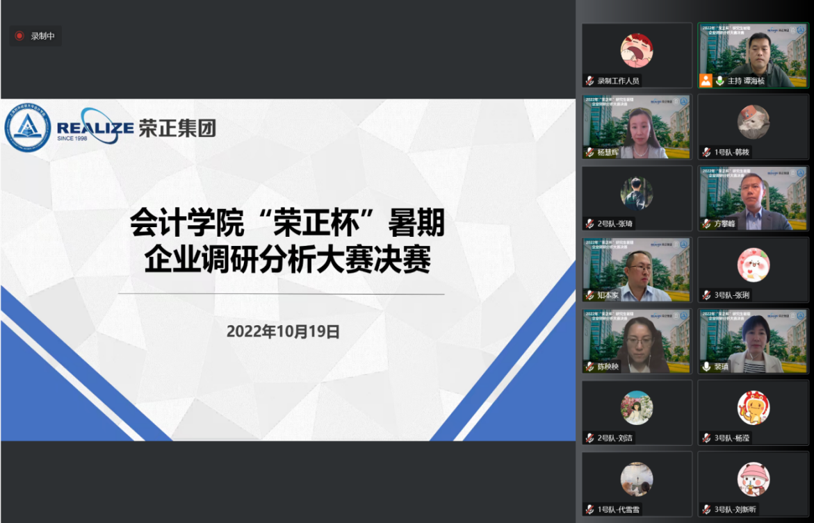 为发挥实践育人和科研育人在研究生创新人才培养中的积极作用,培养和增强研究生的创新意识以及发现、分析、解决企业实际问题的应用创新能力和实践能力,会计学院举办研究生暑期企业调研分析大赛;学院产学研基地——上海荣正企业咨询服务(集团)股份有限公司赞助冠名。此次大赛是学院强化深度产教融合协同育人的一个重要举措,为研究生提供了学术交流、学以致用、服务社会的实践平台。大赛决赛于1019日在腾讯会议云端精彩呈现。荣正集团董事长兼首席合伙人郑培敏先生、荣正集团常务副总经理兼资深合伙人方攀峰先生和学术专家评委华东政法大学MPAcc中心主任陈秧秧副教授出席并担任评委,学院院长裴瑱教授、副院长杨慧辉教授、各支参赛队伍及指导老师参加本场决赛。决赛由MPAcc教育中心副主任谭海桢主持。