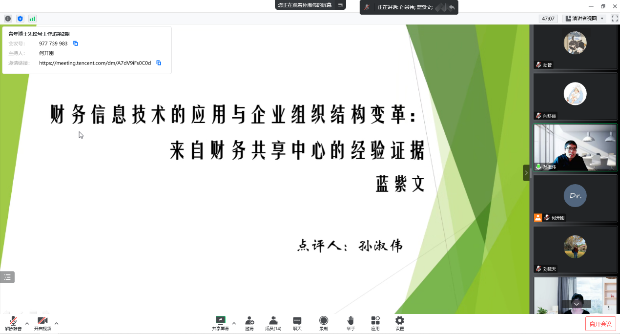 会计学院“青年博士先锋号”工作坊第二期于1025日下午在线如期召开,活动主要围绕蓝紫文博士的一篇研究论文展开。本次会议由“青年博士先锋号”负责人何开刚博士主持,主讲人为蓝紫文博士,点评人为孙淑伟博士,学院的宣扬、孟怡珺、闫珍丽、郑娟、朱梅、孔德松、曹雅楠、高翀、陈良银、梁思源、刘筱天博士出席了此次会议。
