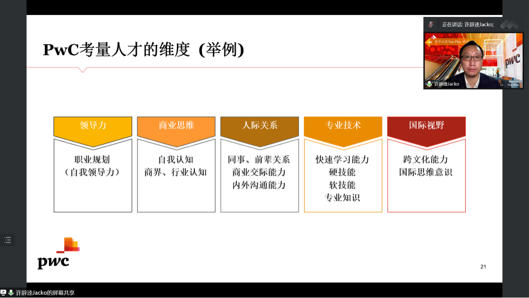 本次讲座许老师通过生动的图片及视频向学生介绍了三个部分的内容:普华永道介绍、普华永道用人标准以及学生发展建议。