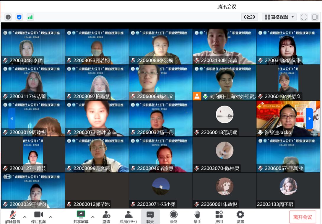 为了帮助2022级本科新生了解财会行业人才发展方向,知晓热门发展行业的用人标准,明晰自己的职业规划,提升自己的综合能力,会计学院邀请到普华永道ESG可持续发展创新教育事业部资深营运专家jacko许辞逵老师,于11月15日晚以腾讯会议的形式开展了“求职路径大公开 职业规划”主题讲座。本科新生辅导员刘向阳和2022级全体本科新生参与了此次讲座。