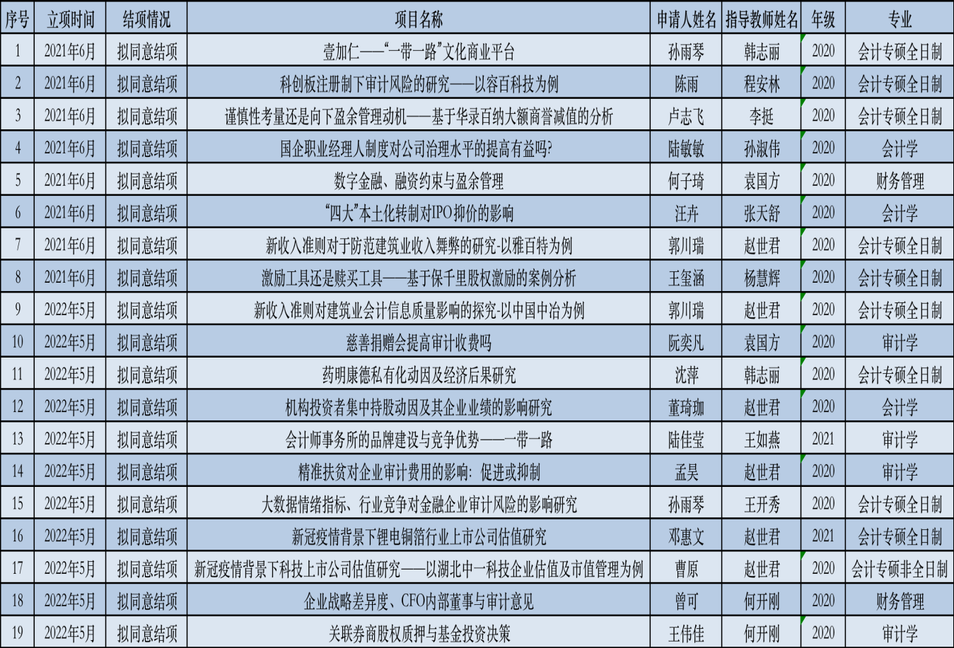 按照我院《关于会计学院2021-2022年“毓秀计划”研究生创新项目结项通知》和《会计学院“毓秀”研究生创新项目资助计划实施办法》,经项目申请人提交结项材料,学院组织校外专家进行双盲评审,拟结项以下19个项目: