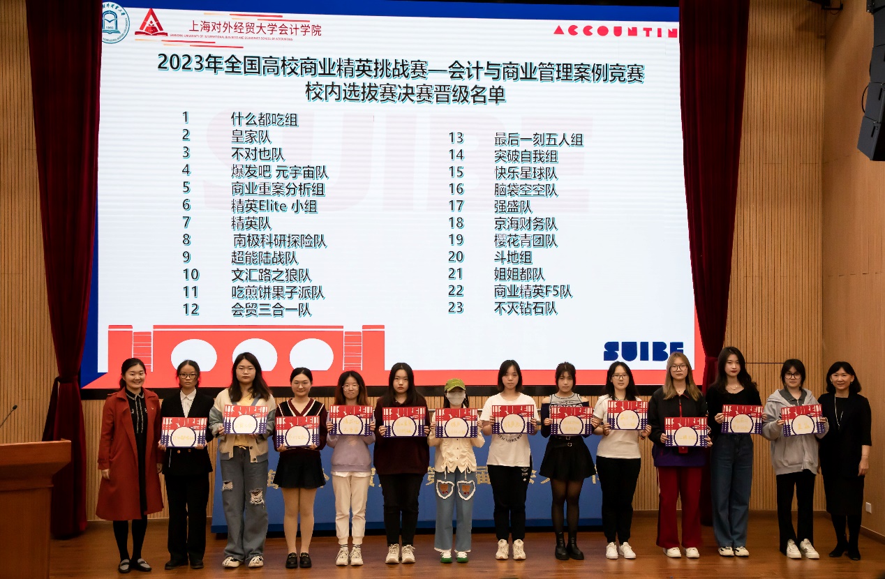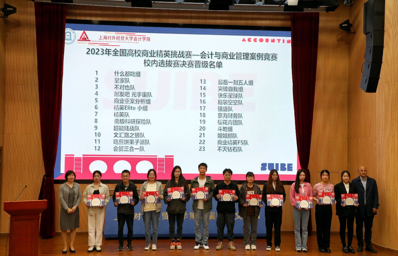 张嵘宣读全国高校商业精英挑战赛——2023年会计与商业管理案例竞赛校内选拔赛决赛队伍的晋级名单,并与裴瑱、缪韵笛、刘海泉三位老师共同颁发晋级卡。