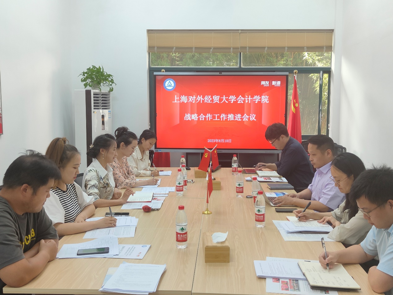 为深化用友新道-上海外经贸会计学院战略合作,810日下午,用友新道-上海外经贸会计学院战略合作工作推进会议在松江校区会计学院会议室顺利召开。会计学院副院长杨慧辉、MPAcc中心副主任谭海桢、研究生教学秘书和辅导员、新道科技股份有限公司上海分公司总经理林斌、教学服务总监张良君、校企合作经理李佳成、教学服务顾问占潘卫参加会议。