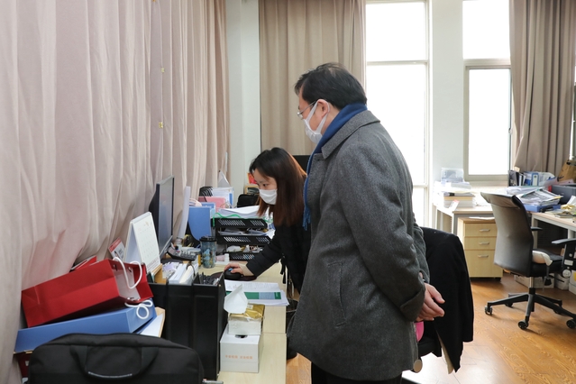 观摩课程在线教学后,汪荣明详细听取了学校在线教学整体工作情况汇报,并慰问了为在线教学提供服务保障的一线工作人员。