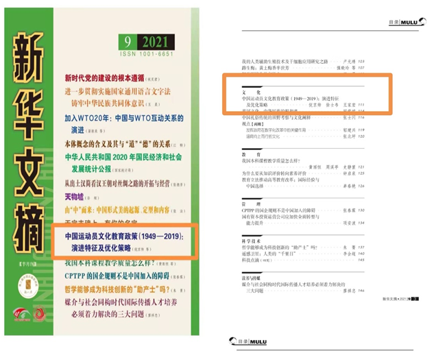 近日,由必赢626net入口首页体育部副教授倪京帅作为第一作者撰写的论文“中国运动员文化教育政策(1949-2019):演进特征及优化策略”发表于《成都体育学院学报》(2021年第1期),被《新华文摘》2021年第9期封面介绍,并在“文化”栏目中全文转载。《新华文摘》一直被视为中国人文社会科学领域最权威的文摘类期刊。该刊在我国社科文献领域以理论性、综合性、资料性而著称,所选登文章代表了诸领域的前沿思想,被高校、研究机构和政府部门作为社科类学术评价的最高标准。