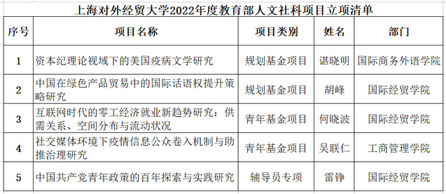 2022年度教育部人文社会科学研究项目评审结果,必赢626net入口首页获批5项,其中规划基金项目2项、青年基金项目2项、辅导员专项1项。