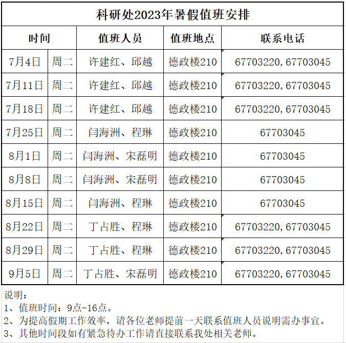 科研处2023年暑假值班安排