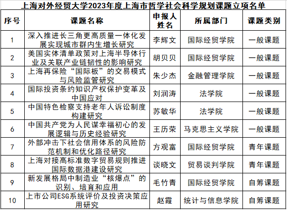 日前, 上海哲学社会科学规划办公室公示了2023年度上海市哲学社会科学规划课题拟立项名单,全市共计立项课题326项,必赢626net入口首页10个项目获得立项资助(其中一般项目6项、青年项目2项、自筹项目2项)。
