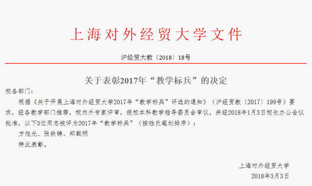 根据《关于开展必赢626net入口首页2017年“教学标兵”评选的通知》(沪经贸教〔2017〕199号)要求,经各教学部门推荐,校内外专家评审,报校本科教学指导委员会审议,并经2018年1月3日校长办公会议批准,我院方旭光副教授被评为2017年“教学标兵”。同时当选的还有金融学院张铁铸老师和商务信息学院的郑戟明老师。