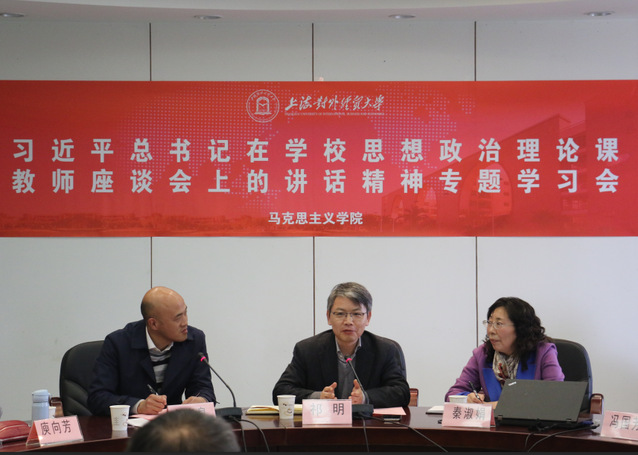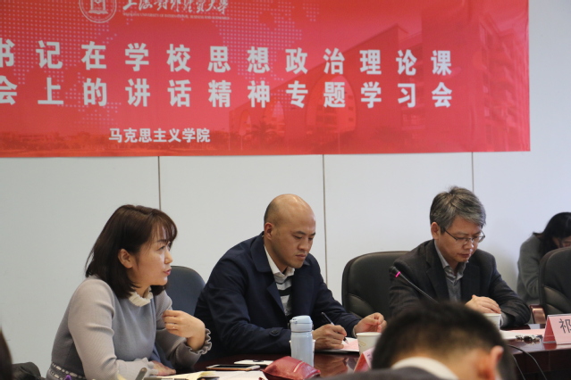 随后,马克思主义学院思想政治理论课教师从不同角度交流了学习体会。冯国芳老师结合自身教学实践,认为推动思想政治理论课改革创新中如何加强亲和力与针对性很重要,其中关键是要熟知马克思主义基本原理。庾向芳老师结合台湾访学经历,对思想政治理论课老师的使命以及教学方法做了深刻思考,认为在日常教学中尤其需要坚持价值性和知识性相统一、理论性和实践性相统一。方旭光老师通过回忆与出席现场座谈会发言代表的接触经历,阐述了思想政治理论课教师对学生成长的关键作用。李秀敏老师围绕如何理解思想政治理论课的重大责任、艰巨任务、大中小学的一体化以及教学如何联系实际等重点内容,表达了此次总书记的重要讲话鼓舞了思想政治理论课教师的信心。吕佳航老师从青年教师角度就如何做好一名思想政治理论课老师谈了自己的理解与体会。大家纷纷表示,作为思想政治理论课教师责任重大,使命光荣,要认真学习习近平总书记的讲话精神,在思政课教学中积极贯彻落实,为培养担当民族复兴大任的时代新人,培养德智体美劳全面发展的社会主义建设者和接班人做出积极贡献。