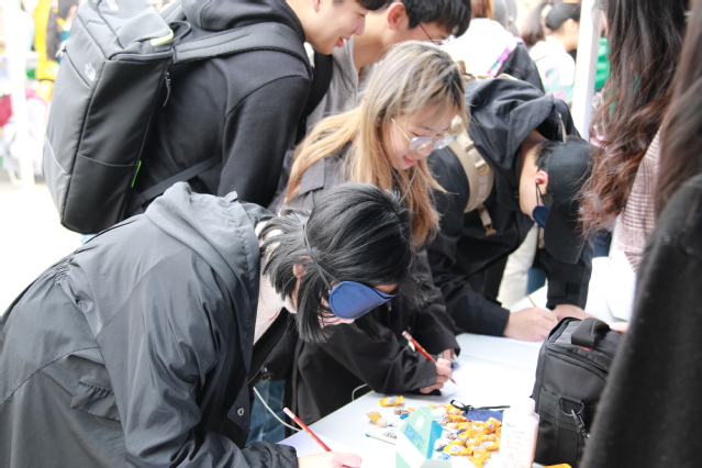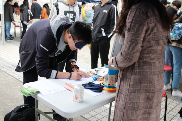 我院设置的活动形式为“盲人作画”,活动要求参加者戴上眼罩根据工作人员要求在纸上作画,完成的画作征得参加者同意后张贴在摊位旁进行展示。简单且不失有趣的活动形式受到现场同学的青睐,活动参加者众多。