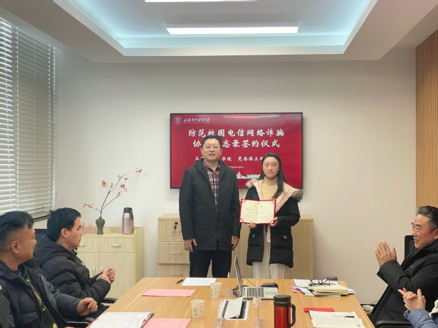 为深入贯彻落实习近平总书记对打击治理电信网络诈骗违法犯罪工作的重要指示批示精神,切实增强学生“识诈反诈”意识和能力,有效维护本校师生财产安全,全面筑牢高校反诈工作防火墙,2024年1月8日,机关党委保卫部(处)与马克思主义学院党总支开展防范校园电信网络诈骗协作备忘录签约仪式。马克思主义学院党政班子成员、保卫处处长李少丹、保卫处副处长马民杰、保卫处相关科室老师以及学院部分师生代表参加仪式。签约仪式由学院党总支副书记(主持工作)刘海泉主持。