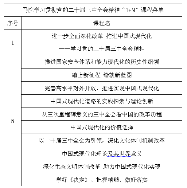 马克思主义学院党总支第一时间制定学习贯彻党的二十届三中全会精神“1+N”课程菜单,致力于讲准、讲深、讲透、讲活全会精神,将全会精神转化为推动学校工作高质量发展的强大精神力量。