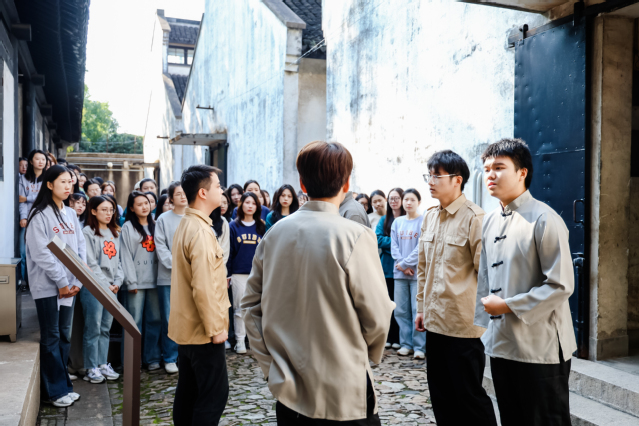 用好大课堂,情景演绎跨越时空。“是什么样的信念让这些共产党员无惧死亡?革命先辈的精神给我们怎样的启示?如果有一台可以穿越时空的对讲机,你想对他们说些什么?”在龙华烈士纪念馆的讲堂里,庾向芳向同学们抛出了三个问题。带着问题,同学们开启了《中国近现代史纲要》第五章第一节的学习,重温大革命失败后的艰难环境。庾向芳带领同学们来到当年关押过近万名革命志士的前国民党淞沪警备区司令部——龙陵监狱,由同学们精彩演绎沉浸式体验剧本《龙华风云》,革命先烈在狱中历尽磨难,仍旧英勇抗争,保持着对革命的坚定信念与不屈不挠的意志,革命先烈的形象更加生动立体地展示在大家面前,在场同学无不动容。
