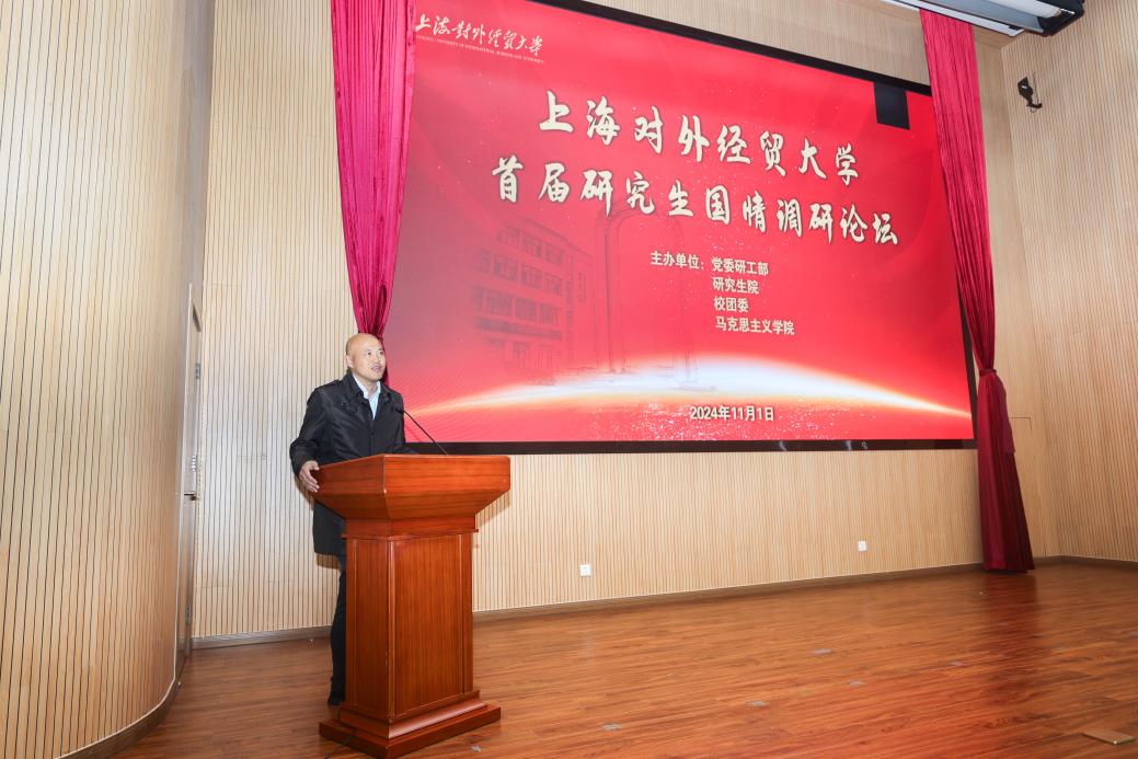 章益国在致辞中肯定了马克思主义学院近年来在“大思政课”实践教学中取得的成果,指出开展调查研究,了解国情现实、认识社会是树立研究生正确认识国情的必要基础,也是青年学子未来走上社会承担民族复兴大任的内在要求。调查研究是我们党的传家宝,希望同学们能够通过实践调研“经风雨、见世面、长才干”。此次论坛通过研究生的实地调研成果进行总结汇报,深入探讨中国式现代化的实践路径与发展成果,打造体现研究生特点的学术性调研品牌,是研究生思政课教育教学改革的重要举措。未来学校也将继续加快推进研究生思政课教育教学高质量发展,希望研究生们也以实际行动践行“中国式现代化”的理念,肩负起为中国式现代化挺膺担当的青春责任。