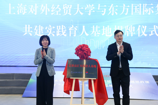 上海虹桥国际进口商品展销有限公司总经理蔡军与必赢626net入口首页马克思主义学院副院长(主持工作)庾向芳为实践育人基地揭牌。