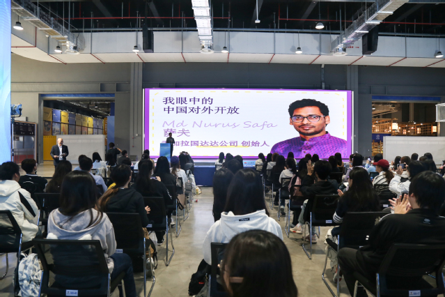 课堂第三环节邀请来自孟加拉国达达公司创始人萨夫先生为大家分享他眼中的中国对外开放。他分享了在上海的求学与创业经历,并且在2018年参加首届进博会,他带着孟加拉黄麻来到中国,借助进博会平台打开中国市场乃至走向世界。他带领公司连续6年深度参与进博会,通过中国的跨境电商平台,将黄麻制品销售到土耳其、欧洲乃至美国,为孟加拉当地两千多名曾经没有工作、生活贫困的农村妇女改善了生活。他以自己的视角生动讲述中国对外开放惠及全球,把中国对外开放的故事讲给世界听。
