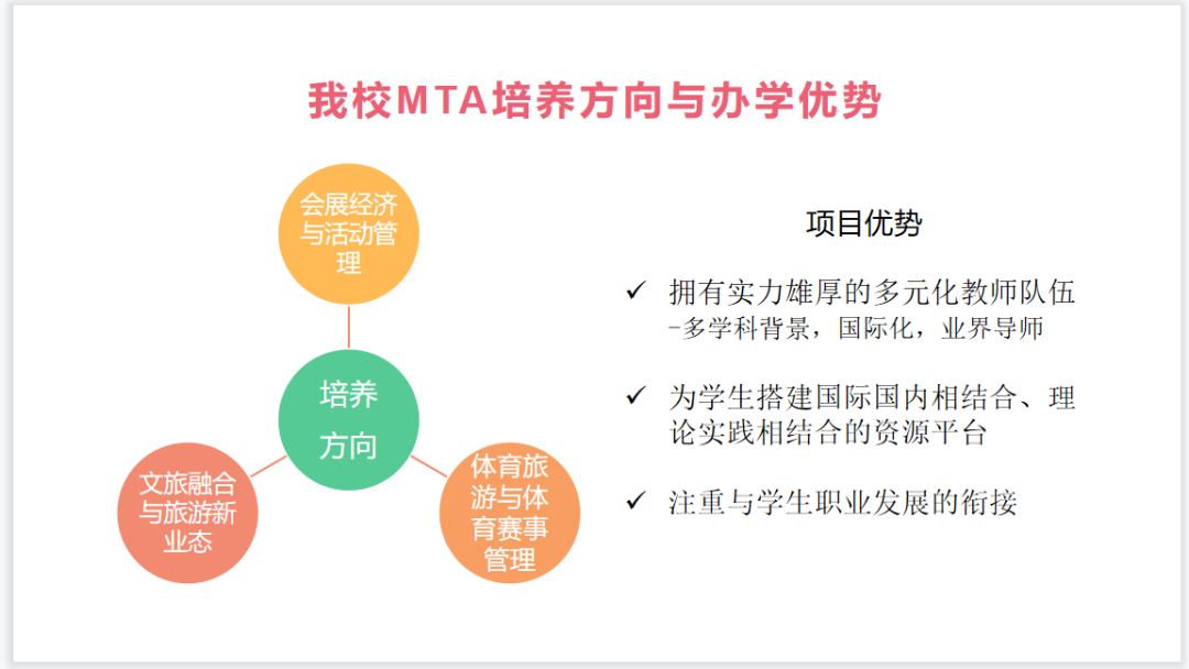 旅游管理硕士专业学位(Master of Tourism Administration,简称MTA)是在我国旅游业迅速发展大背景下,经国务院学位委员会于2010年3月批准设置的,旨在培养旅游行业高层次应用型专门人才的教育项目。必赢626net入口首页MTA项目针对行业发展需求,拟开设会展经济与活动管理、文旅融合与旅游新业态、体育旅游与体育赛事管理3个方向。