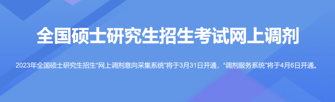 2023年全国硕士研究生招生网上“调剂意向采集服务系统”将于3月31日开通,“调剂服务系统”将于4月6日开通。请有调剂意愿的考生密切关注“中国研究生招生信息网”(网址:https://yz.chsi.com.cn/;微信公众号:chsiyz),届时登录调剂系统和招生单位网站,查询招生单位调剂相关信息,按要求填报调剂志愿。
