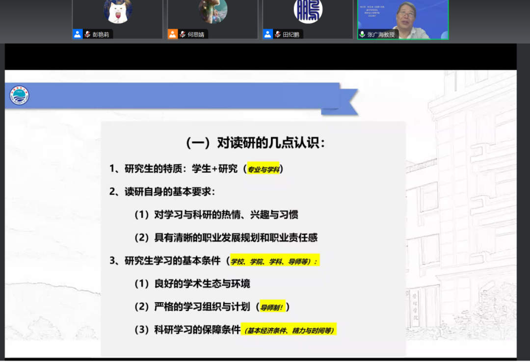 田纪鹏就“应用型高校如何平衡研究生科研与实践的能力”以及“如何把控专硕毕业论文的选题和指导”与张广海教授进行了交流。张教授表示,专硕和学硕研究生要在实践环节进行区分,专硕研究生培养要注重课程学习与综合学习的相结合、强化提升学术素质。针对毕业论文,在选题阶段要统筹“导师+学生+学院”三方特点,形成专业的论文体系。田纪鹏总结道,如何高水平地完成毕业论文是每位研究生面临的学业大关,培养学生的科研能力、提升导师的指导能力是提升毕业论文质量的关键。