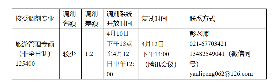 根据调剂系统第一批和第二批填报和复试情况,会展与传播学院旅游管理专硕(非全日制)(125400)继续接收调剂,欢迎咨询。