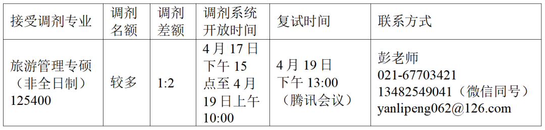 根据调剂系统第一批和第二批填报和复试情况,会展与传播学院旅游管理专硕(非全日制)(125400)继续接收调剂,欢迎咨询。