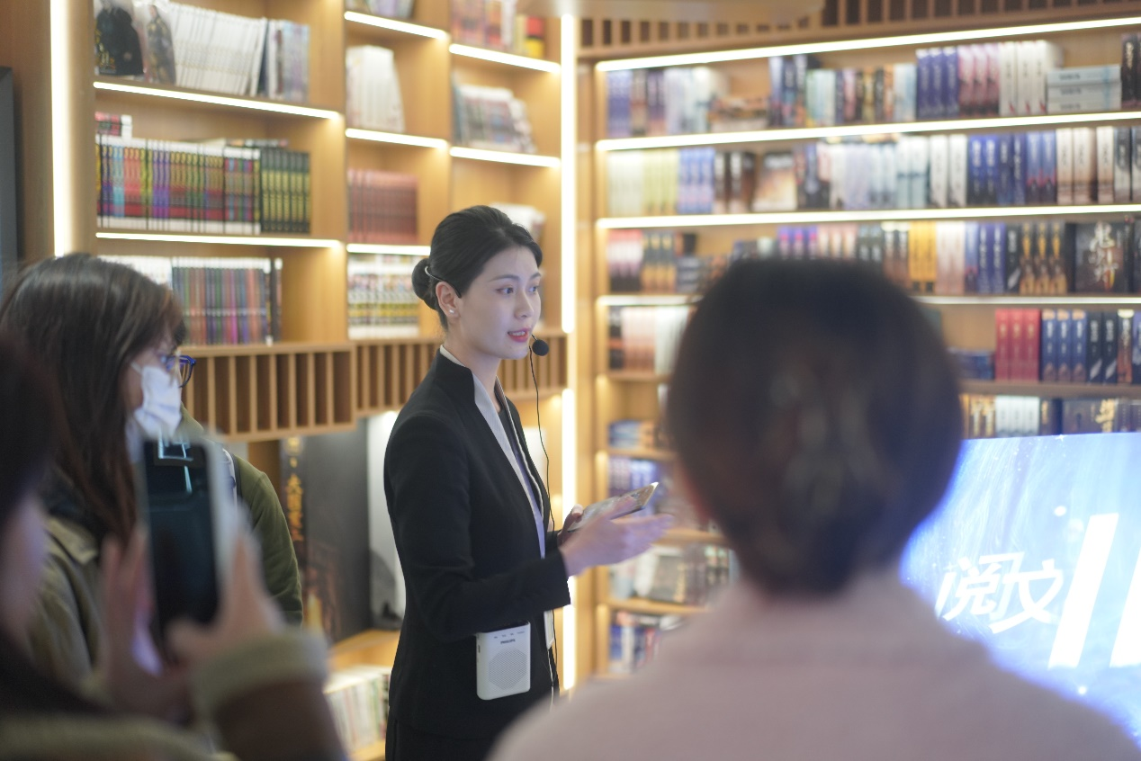 活动分为三个部分,分别是“阅文展厅参观”“业界经验分享”和“案例议题探讨”。首先,讲解员带领师生参观了阅文展厅,包括观影走廊、游戏区、动漫区、影视区、党建区等多个区域,向师生展示了阅文集团的发展历程、业务范围和IP运营成果。