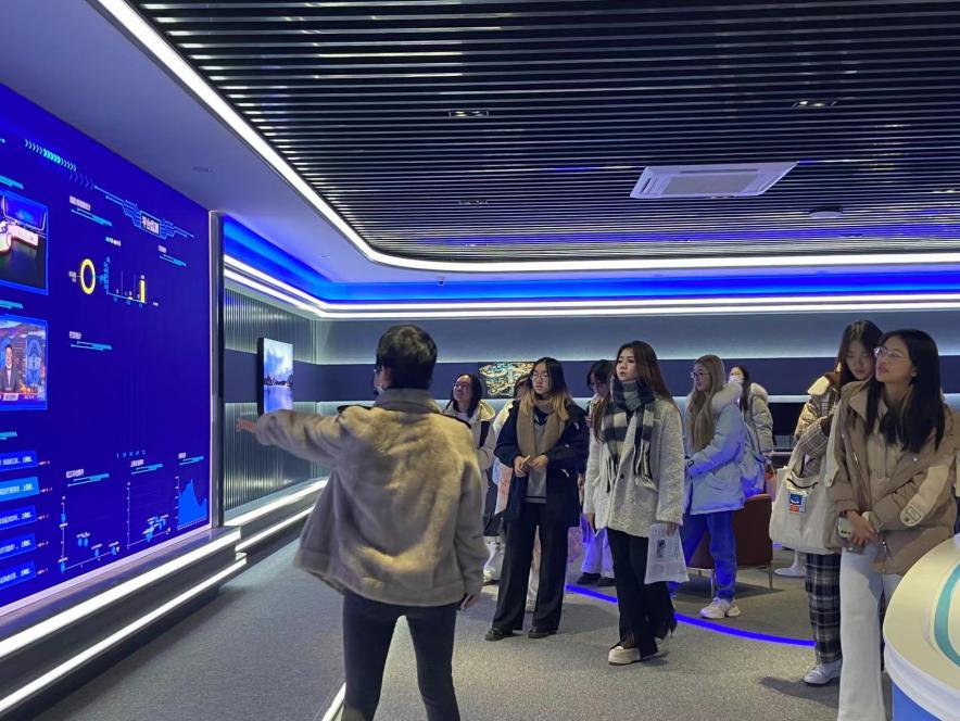 在讲解员的带领下,师生们探秘松江融媒体中心,先后参观融媒体中心展厅、电视演播厅、可视化直播间、以及指挥大厅等工作地点,了解松江融媒体中心在媒体融合方面的成功探索,其微信公众号“上海松江”曾荣获全国县融中心优秀案例。通过参观,同学们了解了媒体内容生产的流程,也对当前媒体深度融合背景下主流媒体的发展方向有了更深刻的认识。