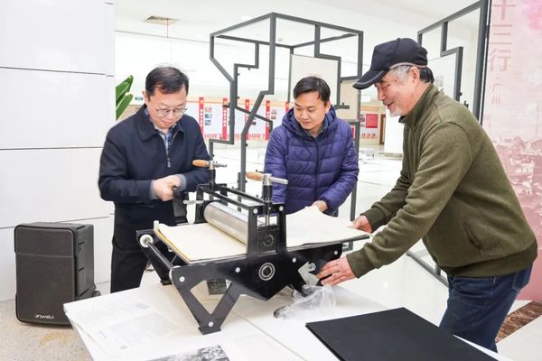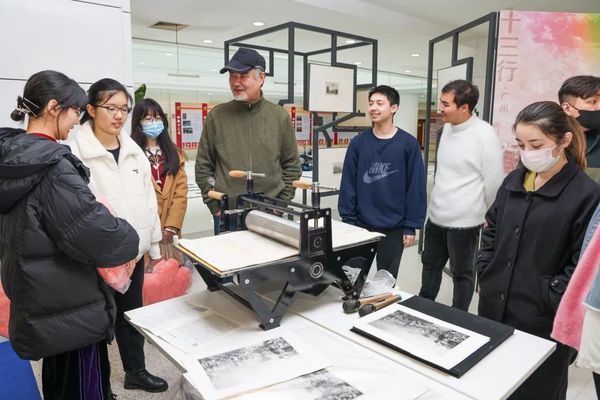 仪式上的答谢环节,汪荣明向朱浒赠送了由铜版画大师、艺术家沈忠海先生亲手复刻的铜版画作为纪念。此外,作为美育工作的现场教学,汪荣明还在仪式现场亲手制作了铜版画赠予学生代表,让同学们感受到了铜版画的艺术魅力。