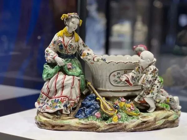 这件藏品是18世纪法国的陶瓷厂生产的,确切来说是一件法国仿制中国瓷器的陶器。一开始,欧洲并没有中国的制瓷技术,而当时的法国皇帝路易十四(又称太阳王)对中国文化展示出了极大的狂热,派出很多名传教士到中国,学习中国的文化、了解中国瓷器制作技术。传教士借着帮清朝康熙皇帝制作地图,来到了景德镇,最终获得制瓷配方,把技术带回欧洲。这件陶器上的人物有着西方人深目高鼻的特征,服饰和发型却是中式的,将中西文化融合在了一起。