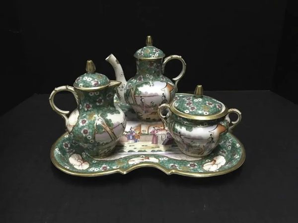 这是一套欧洲皇室贵族到中国定制的出口瓷。此套器物收藏价值很高,观赏性也很强。茶具的器形按照西方饮茶习惯配有一个水茶壶,一个奶壶,一个放糖的缸三件套,和一个托盘。茶具设计的人物、风景和花卉采用的是东方元素,然而色调却是采用了西方油画的粉彩色调。是一套极具代表性、体现中西文化融合的出口定制瓷。
