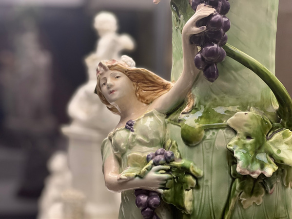 19世纪末安夫拉茨新艺术风格的花瓶。在1880年之前,欧洲艺术追求的是古典艺术,即讲究精致豪华、富丽堂皇,属于皇室贵族专用的。1880年之后,安夫拉茨新艺术风格开始兴起,其崇尚自然,将大自然的花、草、鸟、人物融于设计,产生了平民化的新艺术风格,这也标志着欧洲瓷器从贵族文化走向大众。