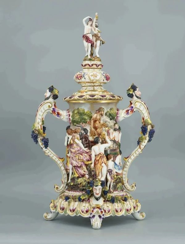 首展镇展之宝,意大利那不勒斯制19世纪末纪念葡萄丰收狂欢酒会场景的瓷罐。这件瓷罐立体感很强、精致度很高。展现了当时意大利红酒丰收之后,酒会的喜庆和狂欢。由意大利北部南部的著名的皇室陶瓷工厂所造,欧洲的波旁皇朝的查理三世皇帝亲自组建并邀请皇室顶级珠宝设计师作为厂长,打造了这件瓷罐。