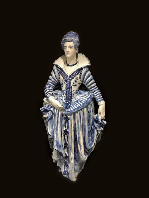 戴夫维尔女皇酒罐。17世纪末,位于荷兰的戴夫维尔为了市场竞争,复刻中国青花瓷,研制出一种形似青花瓷的戴夫维尔蓝白陶,当时在欧洲的销量非常好。这件展品是一个女皇缩小版的人物雕塑,是一个用于装葡萄酒的酒罐,既放在家里作为装饰,也很实用。欧洲的艺术作品不但追求欣赏,还追求实用价值,从艺术作品变成了艺术日用品,代表一个时代的艺术的进化,也代表中国青花瓷对欧洲瓷的影响。