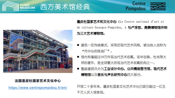 蓬皮杜国家艺术和文化中心(Le Centre national d'art etde culture Georges-Pompidou,)作为西方知名美术馆,与卢浮宫、奥赛博物馆并称为三大艺术博物馆。馆内有着超过10万件现当代艺术收藏,如毕加索、杜尚等大师的著作,是全球最大的现当代艺术收藏机构之一。建筑采用后现代艺术风格,被当地人戏称为“市中心的炼油厂”,共分为工业设计中心、公共情报图书馆、现代艺术博物馆以及音乐与声乐研究中心四大部分。开馆二十多年来,蓬皮杜国家文化艺术中心已吸引超过一亿五千万人次入馆参观。