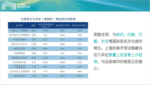 放眼全球,与纽约、伦敦、巴黎、东京等国际知名文化城市相比,上海的美术馆设施建设近几年在数量上呈显著上升趋势,与这些城市的差距正在缩小。