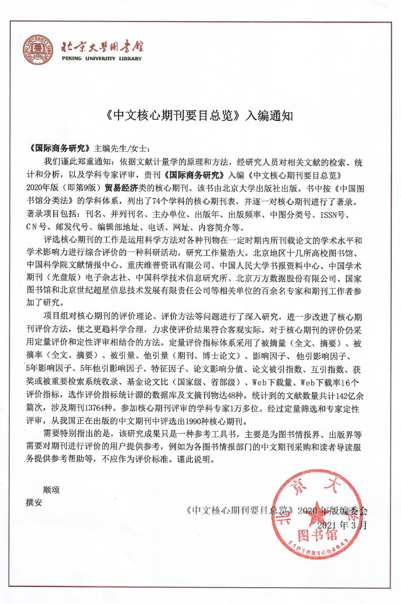 2021年3月12日,《国际商务研究》编辑部收到北京大学图书馆通知,《国际商务研究》入编《中文核心期刊要目总览》(2020年版)。《国际商务研究》1991年被列为世界经济类中文版核心期刊,此后连续被收录为贸易经济类中文核心期刊。