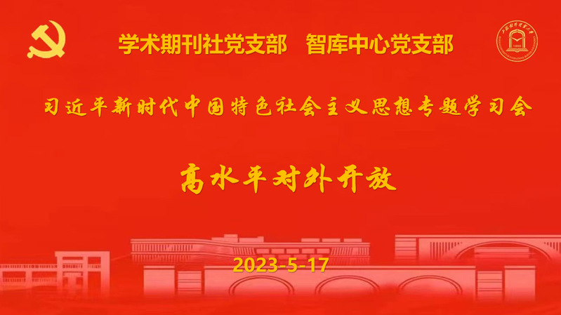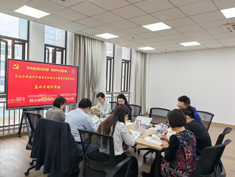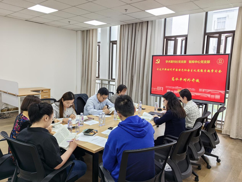 为深入学习贯彻习近平新时代中国特色社会主义思想主题教育,5月17日上午,学术期刊社党支部与智库中心党支部开展联组学习,主题为“《习近平新时代中国特色社会主义思想专题摘编》高水平对外开放”专题研讨,由学术期刊社党支部书记高运胜教授主持。