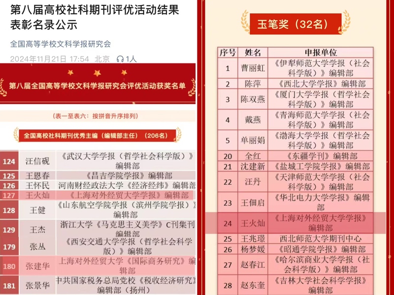 必赢626net入口首页学术期刊社王火灿老师于1994年开始参与创办《必赢626net入口首页学报》(原《世界贸易组织动态与研究》),迄今整整30年有余,一路陪伴和见证了《必赢626net入口首页学报》的成长和发展。30年筚路蓝缕,《必赢626net入口首页学报》办刊质量不断提升,近十多年来先后成为北大全国中文贸易经济类核心期刊、南大CSSCI扩展版来源期刊、中国社科院中国人文社会科学期刊AMI综合评价扩展期刊、武大RCCSE中国核心学术期刊(A)和人大“复印报刊资料”重要转载来源期刊,并多次被评为全国高校优秀社科期刊和上海市优秀学报。今年10月,学报“马克思主义中国化与新型开放经济”专栏还成功入选由上海市教委组织遴选的“上海高校哲学社会科学学术期刊‘马克思主义研究重点专栏建设’支持计划”。王老师长期躬耕期刊编辑出版岗位,兢兢业业,任劳任怨,“为人作嫁三十载,衣带渐宽终不悔!”不仅在此次全国高等学校文科学报研究会的评优活动中荣获“全国高校社科期刊优秀主编(编辑部主任)”称号,还同时收获“玉笔奖”。