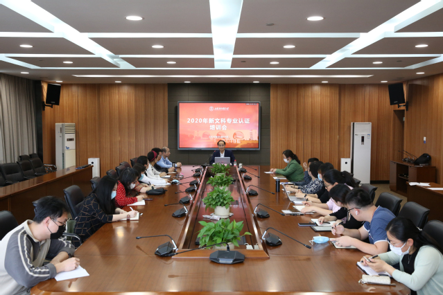 2020年5月15日下午,学校在德政楼317室组织2020年新文科专业认证(自主专业认证)培训会,邀请东华大学姚卫新教授作《专业认证的准备工作及自评报告撰写》专题培训。商务英语、会计学、市场营销等国家级一流本科专业建设点负责人和教师以及相关教学单位分管教学工作负责人参加培训。