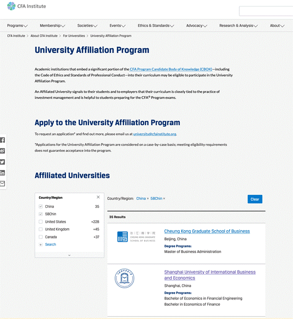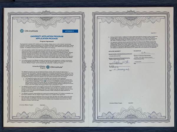 CFA 协会的宗旨是通过建立金融投资领域最高的专业水平、职业道德标准与教育风范,引领全球的金融行业发展。自1962年设立CFA课程以来,CFA协会所推广的金融理念、专业知识、准则及道德被广泛认知与认可,成为全球金融行业公认的最高标准。CFA协会大学联盟项目是CFA协会旨在全球高校中推行以道德伦理为基础,将CFA特许分析师所必需具备的专业知识和能力纳入联盟高校学位教育体系中的认证项目,该项目是国际一流商学院金融学项目高水平应用型人才培养的通常配置。