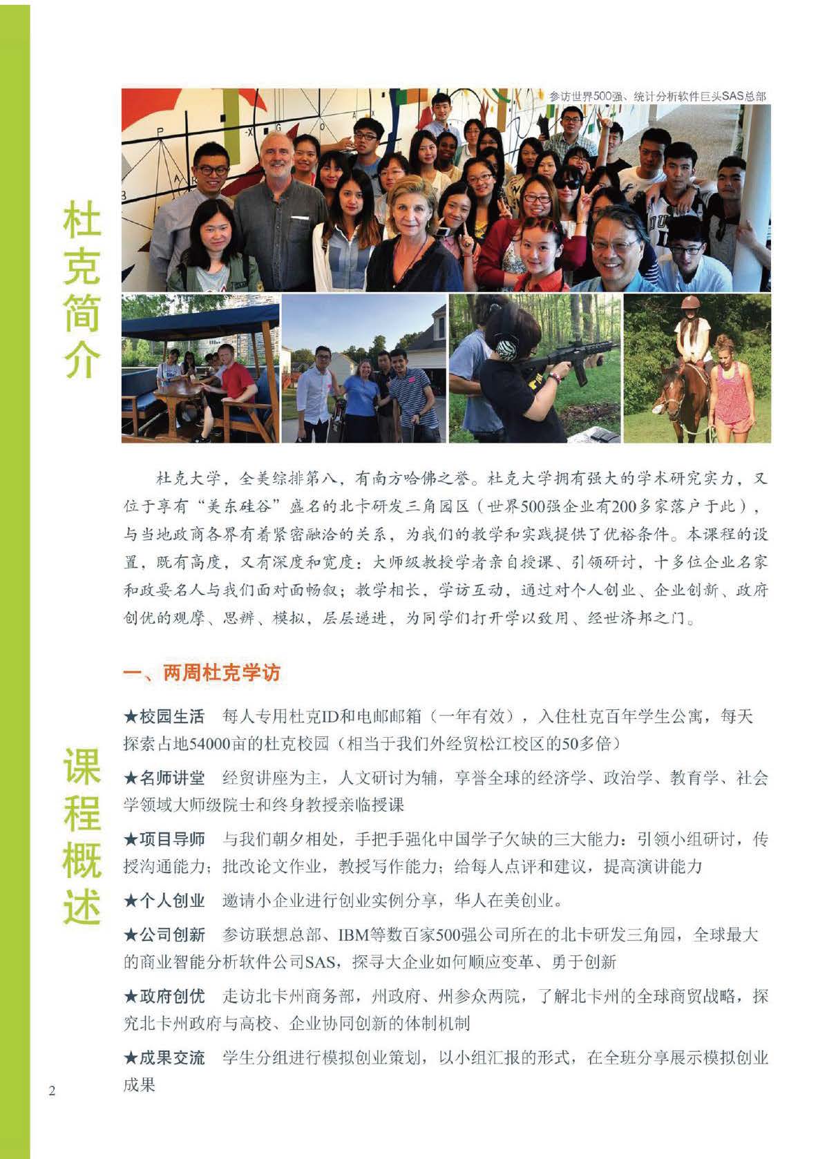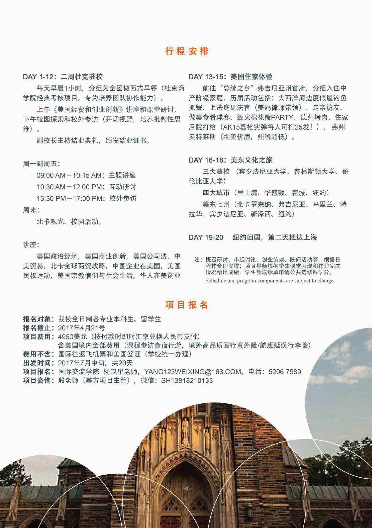 2.1本项目20天,由两周杜克大学学习参访以及近一周的美国住家体验及美东文化之旅组成。上午《美国经贸和创业创新》讲座和课堂研讨,下午参观北卡州的各类活动及讨论。晚间参与杜克校园生活(体育比赛、音乐会、论坛等)若时机凑巧赶上赛季,也可能会亲临NCAA现场,杜克大学有着全世界最好的篮球队!
