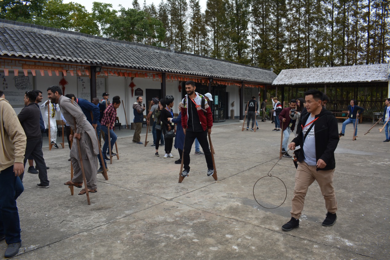 14日下午,留学生们来到江南三民文化村。三民文化村位于崇明生态岛中北部,以江南地区传统的民间、民俗、民族文化元素为主题,按衣、食、住、行、艺、玩、商为分类,是非物质文化遗产挖掘、展示和传承的重要基地。在工作人员带领下,留学生参观了崇明四大特色展示馆和56个民间民俗展览馆,观看地方“扁担戏”,体验了滚铁环、踩高跷、舞龙、制作土布贴画等民俗活动,深入了解了三民文化村的发展历史与建设成果,感受中国传统民俗文化。