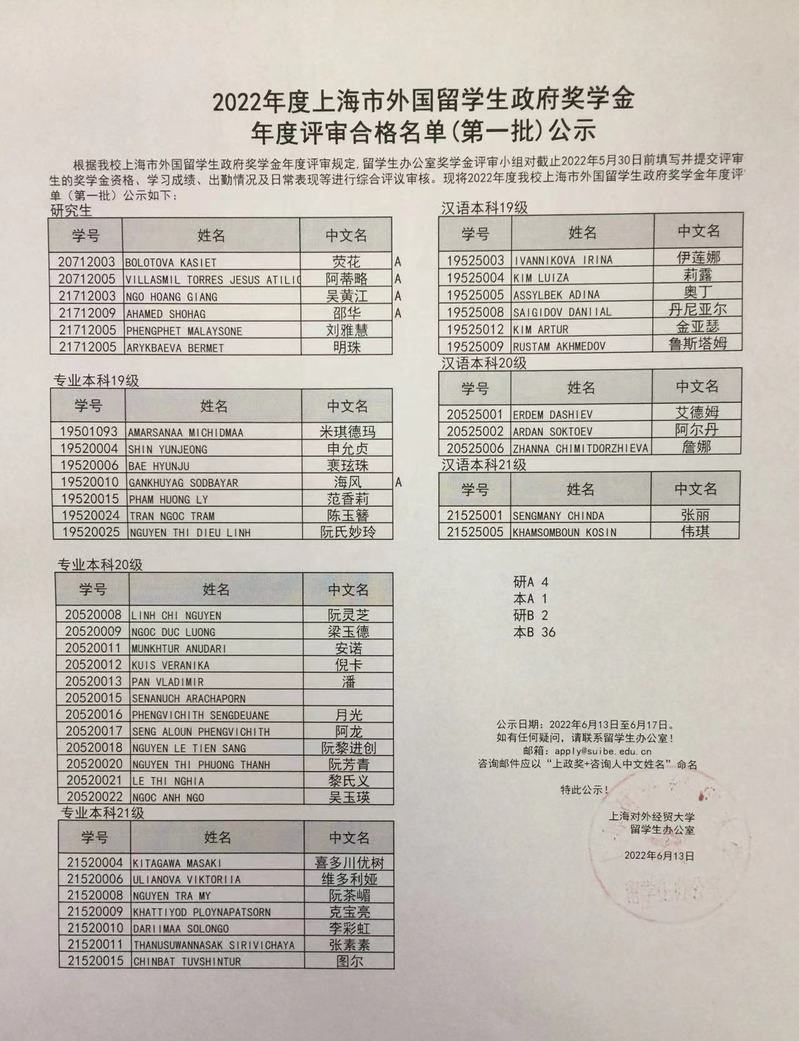 2022年度上海市外国留学生政府奖学金年度评审合格名单(第一批)公示