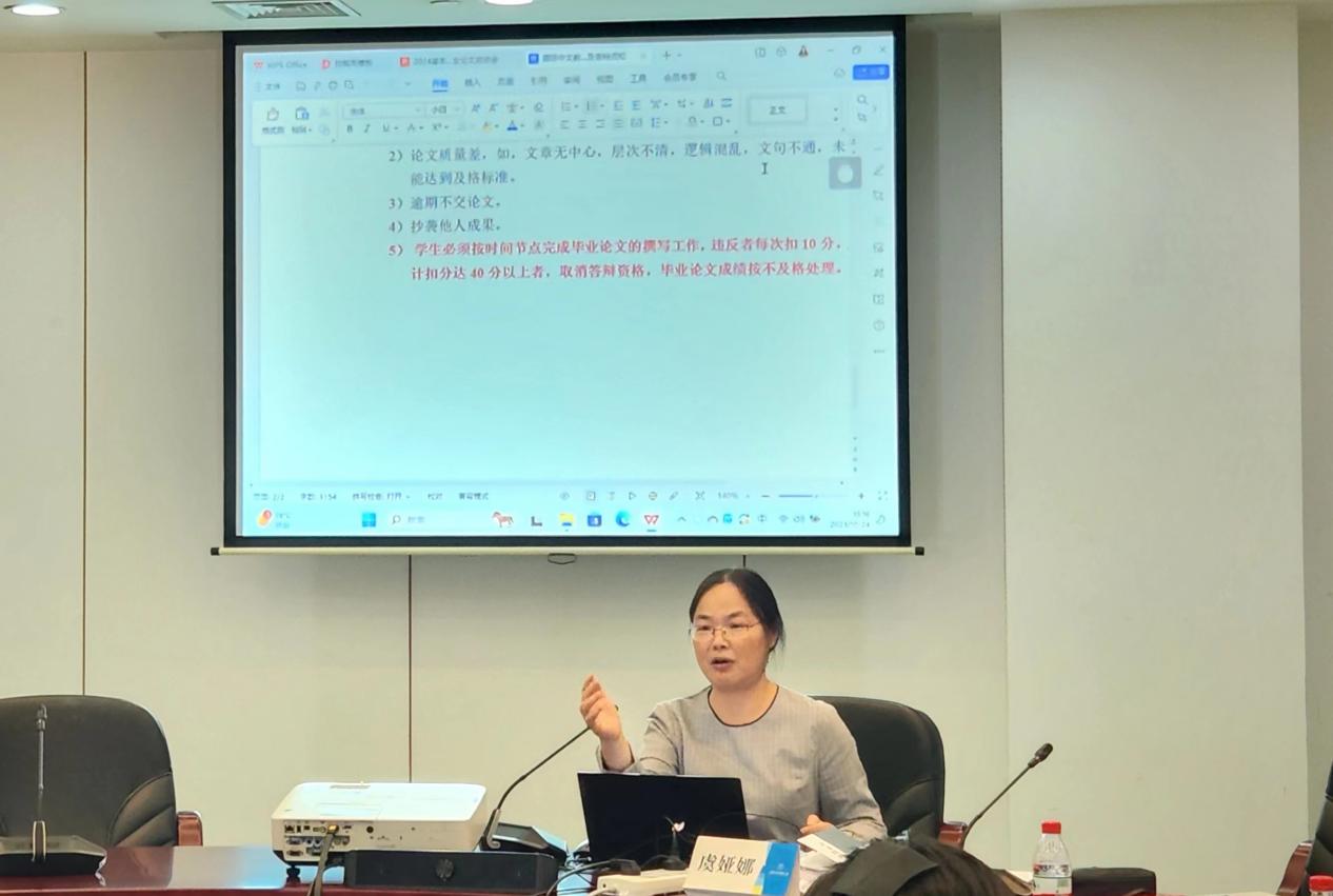 会上,虞娅娜强调,一是提高认识,论文撰写是本科教育教学的重要环节,同学们要深刻认识论文撰写的重要性;二是论文选题多样化,理论与实践相结合,提升毕业论文的内涵;三是严格按照时间进度,提高毕业论文各环节的工作效率和质量。专业主任李春桃现场宣布毕业论文指导分工,并为与会同学和指导教师作毕业论文撰写规范的指导培训,培训内容主要包括毕业论文的总体要求、论文选题、开题报告、写作流程及撰写规范、答辩流程、过程性管理资料整理等。会后,论文指导老师对学生进行了“一对一”论文撰写指导。