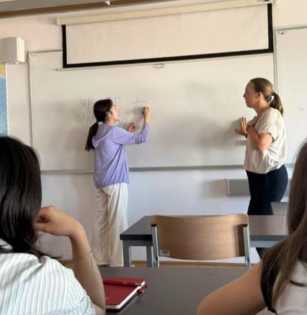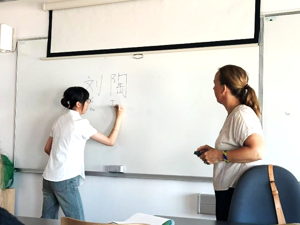 在夏令营第一天的中级汉语班的课堂上,当地汉语教师Anja(安妮雅)以轻松的对话方式检查了学生们的语言掌握情况。当发现学员们的汉语水平存在较大差异:个别学生已掌握基本声调及简单汉字,但多数学生仍主要依赖拼音学习后,为增进师生互动、激发学习兴趣,Anja老师灵活调整了教学计划,带领实习团队的汉语小老师们以“汉语姓名”为切入点,展开了一场生动有趣的汉字启蒙课,进而复习巩固旧知识。后半段,师生共同学唱中文歌曲《热爱105°C的你》,学生积极性高涨。文化问答环节涉及佛教、老子思想等内容,为后续教学优化提供进一步参考。